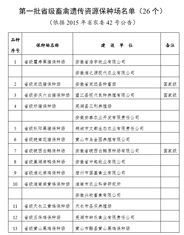 为贯彻落实《安徽省人民政府办公厅关于加强畜禽遗传资源保护利用促进畜禽种业发展的意见》(皖政办秘〔2015〕231号),根据省农委《关于印发安徽省畜禽遗传资源保种场保护区和基因库管理暂行办法的通知》(皖农牧〔2015〕2号,以下简称管理暂行办法)文件要求,在去年确定第一批28个保种场(区、库)(见附件2)的基础上,经研究,决定开展第二批省级畜禽遗传资源保种场、保护区和基因库申报工作。现就有关事宜通知如下: