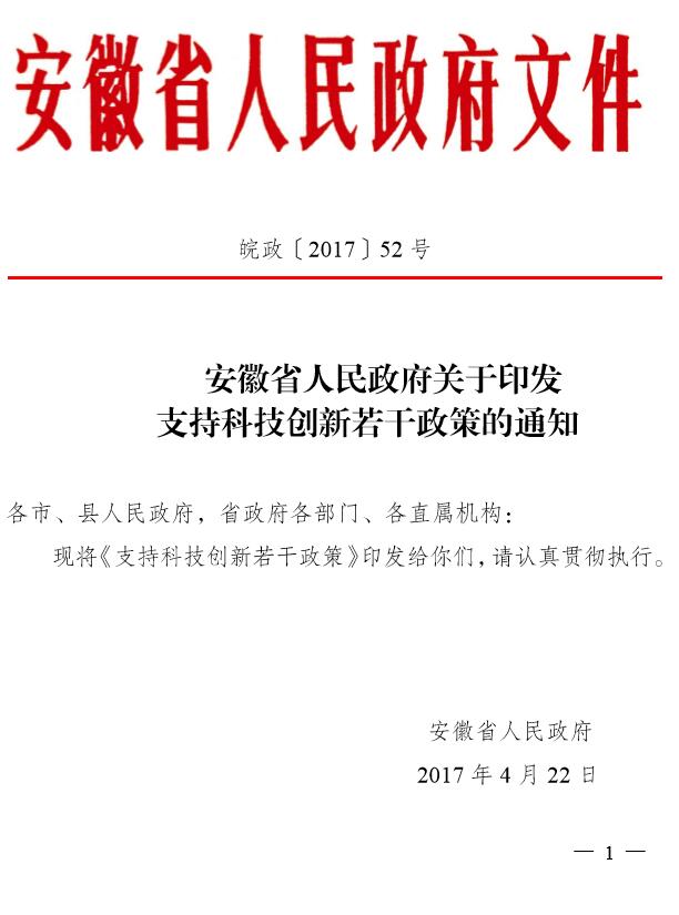 安徽省人民政府关于印发支持科技创新若干政策的通知