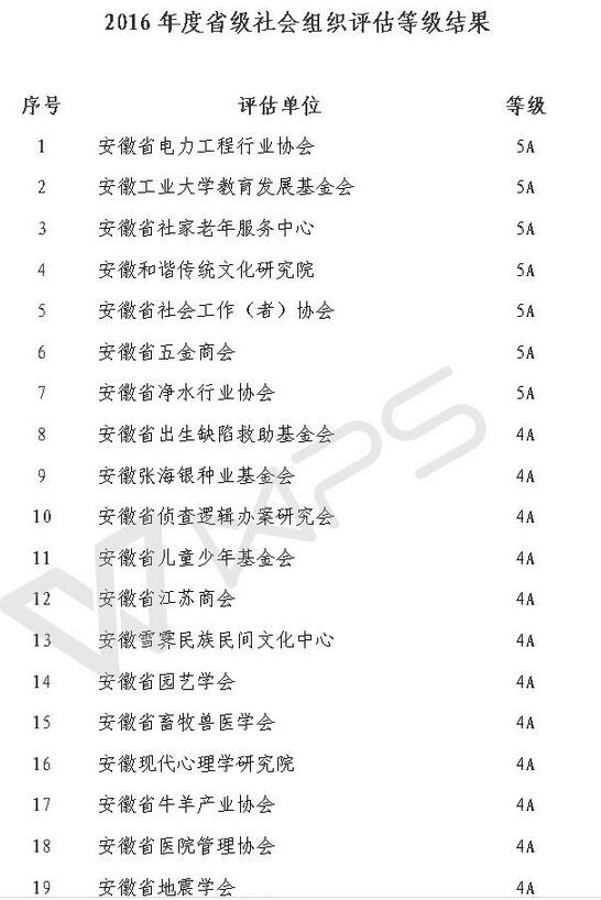 根据《安徽省社会组织评估管理办法》的规定,遵循“政府指导、社会参与、独立运作”的社会组织综合评估机制,依照评估指标和评估工作程序,经过评估专家组初评和省社会组织评估委员会终评,评定出2016年度省级社会组织评估等级。我协会第一次参加等级评估: