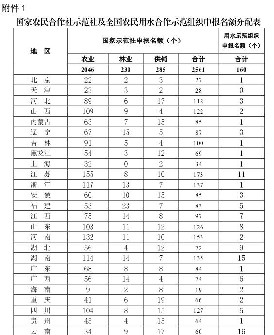 附件:1.国家农民合作社示范社及全国农民用水合作示范组织申报名额分配表