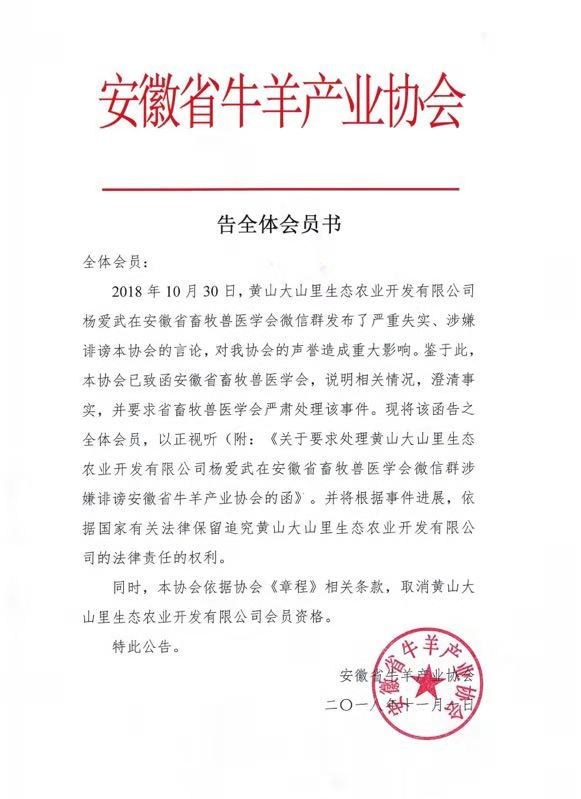 关于取消黄山大山里生态农业开发有限公司 安徽省牛羊产业协会会员资格的公告