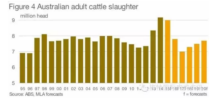 澳大利亚肉类和畜牧协会对2015最后一个季度屠宰量增长放缓的分析,MLA预测:下一年的情况变得更糟,在干旱的持续影响下,预测2016年的屠宰量将降低到780万头,2017年更是降低到700万头。如果这些预测是接近准确的,它会在未来几年内对中国牛肉进口贸易会产生影响。