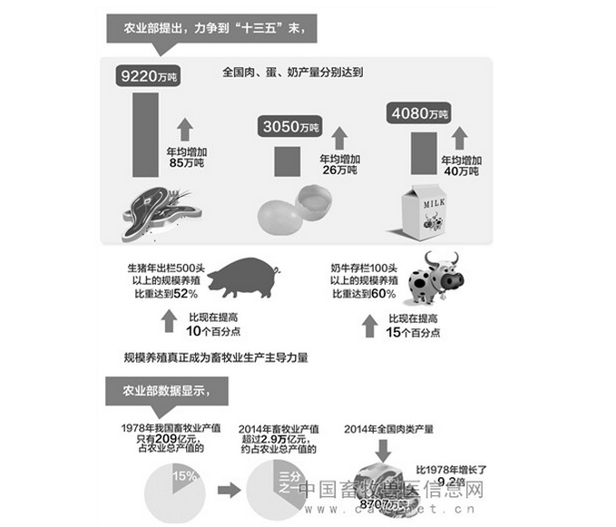 从“吃肉等过节”到“肉盘子”极大丰盛,这是老百姓的真实感受。从家庭副业到成为占农业三分之一的大产业,是畜牧业自身发展的真实反应。农业部最新数据显示,我国畜牧业年产值超过2.9万亿元,人均肉类占有量近64公斤,目前,直接从事畜禽养殖的收入占家庭农业经营现金收入的六分之一。
