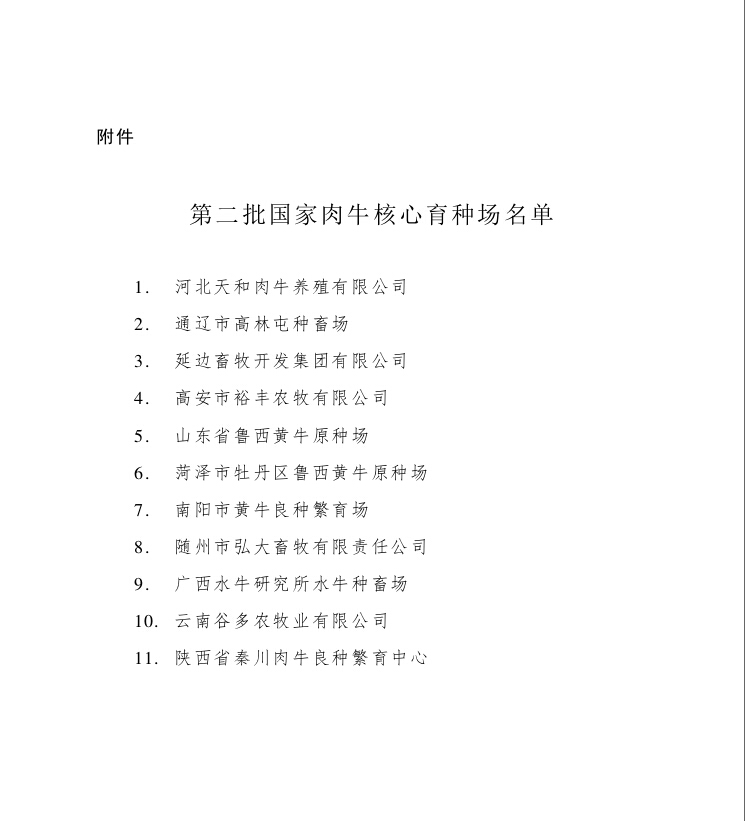 根据《全国肉牛遗传改良计划(2011-2025)实施方案》的规定,我部组织全国肉牛遗传改良计划工作领导小组办公室和专家组对国家肉牛核心育种场申报企业进行了形式审查和现场评审。根据评审结果,现公布河北天和肉牛养殖有限公司等11家企业为第二批国家肉牛核心育种场(名单见附件)。各地要加强对国家肉牛核心育种场的监管,继续做好肉牛育种企业审核推荐工作,确保国家肉牛核心育种场组建工作有序推进。各国家肉牛核心育种场要认真履行规定义务,积极配合专家组,主动开展种牛登记、性能测定、后裔测定、种牛选育等工作。