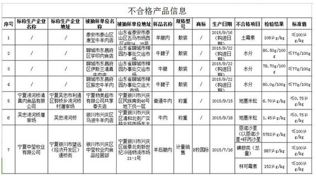 新华网北京1月13日电: 1月12日,国家食药监总局公布新一期的食品抽检信息,名单显示,来自山东省、宁夏回族自治区的7批牛羊肉检出兽药残留不合格。其中,3批次由宁夏中莹牧业有限公司生产的羊后腿肉检出恩诺沙星(以恩诺沙星+环丙沙星之和计)超标57倍,磺胺类(总量)、林可霉素等含量也超标。