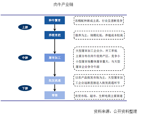 我国养牛业历史悠久,但长期以来牛主要以役用为主。改革开放以来,随着现代化农业技术的普及以及居民牛肉需求的不断上升,我国商品肉牛业开始起步并逐渐形成了上游种牛繁育和养殖育肥、中游屠宰加工、下游产品批发流通和零售的完整产业链模式。