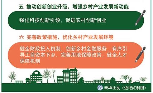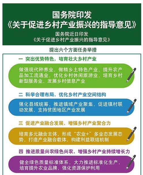 《意见》提出六个方面任务举措。一是突出优势特色,培育壮大乡村产业。做强现代种养业,做精乡土特色产业,提升农产品加工流通业,优化乡村休闲旅游业,培育乡村新型服务业,发展乡村信息产业。二是科学合理布局,优化乡村产业空间结构。强化县域统筹,推进镇域产业聚集,促进镇村联动发展,支持贫困地区产业发展。三是促进产业融合发展,增强乡村产业聚合力。培育多元融合主体,形成“农业+”多业态发展态势,打造产业融合载体,构建利益联结机制。四是推进质量兴农绿色兴农,增强乡村产业持续增长力。健全绿色质量标准体系,大力推进标准化生产,培育提升农业品牌,强化资源保护利用。五是推动创新创业升级,增强乡村产业发展新动能。强化科技创新引领,促进农村创新创业。六是完善政策措施,优化乡村产业发展环境。健全财政投入机制,创新乡村金融服务,有序引导工商资本下乡,完善用地保障政策,健全人才保障机制。