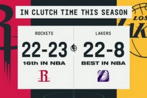 据统计,本赛季常规赛湖人关键时刻战绩为22胜8负,排名联盟第一;火箭关键时刻战绩为22胜23负,排名联盟第16。